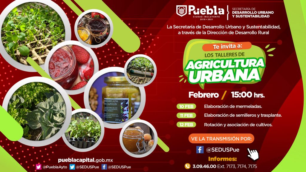 Del 10 al 12 de febrero de 2021, a partir de las 15:00 horas, se transmitirán en vivo -a través de la cuenta de Facebook @SEDUSPue- los talleres de Agricultura Urbana enfocados en la elaboración de mermeladas naturales y semilleros, así como en la rotación y asociación de cultivos.